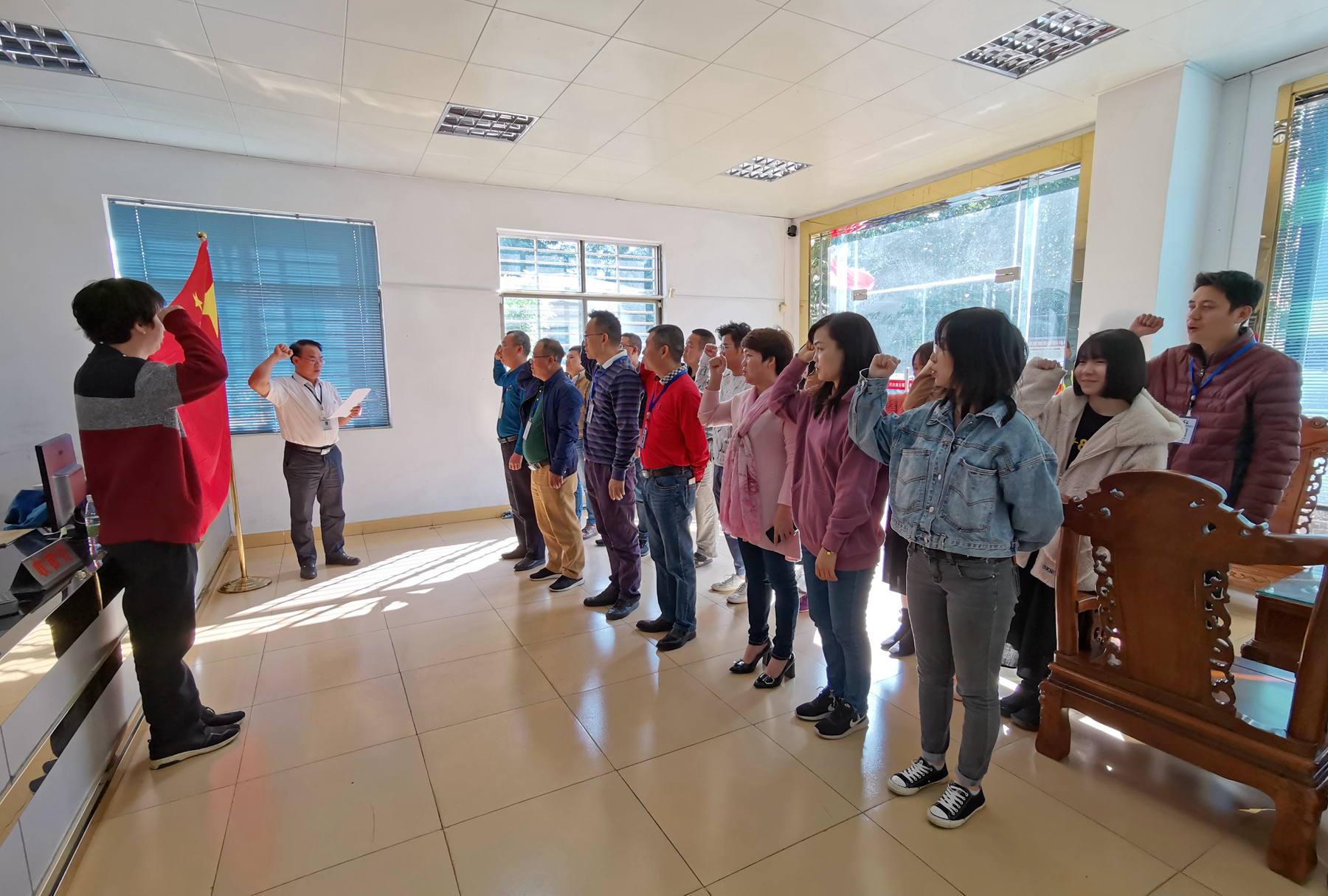 今年12月4日是我国第六个“国家宪法日”。为弘扬宪法精神,增强宪法意识,当天上午10点,省路桥乐竞平台党委组织办公区全体干部职工举行了庄严而神圣的宪法宣誓仪式。省路桥乐竞平台党委书记、董事长吴德海同志带领全体班子成员、干部职工近70人列队站立,面向国徽,右手举拳,庄严宣誓:“我宣誓:忠于中华人民共和国宪法,维护宪法权威,履行法定职责,忠于祖国、忠于人民,恪尽职守、廉洁奉公,接受人民监督,为建设富强民主文明和谐美丽的社会主义现代化强国努力奋斗!”